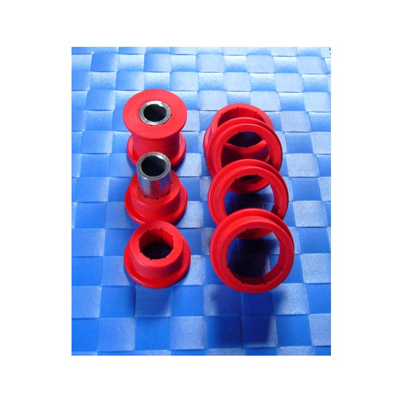Der Satz besteht aus den acht roten PU-Buchsen und den zwei verzinkten Stahlhülsen.